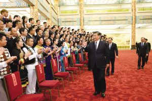 8月31日晚,第六届全国少数民族文艺会演开幕式文艺晚会在北京人民大会堂隆重举行。习近平、李克强、汪洋、王沪宁等党和国家领导人出席观看。这是演出开始前,习近平等会见文艺会演演职人员代表、组委会成员、56个民族的优秀基层党员代表等。新华社记者李学仁摄