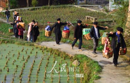 11月17日,新娘家的亲戚朋友挑着贺礼前往新娘家庆贺。