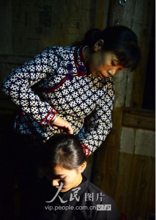11月16日夜,新娘的亲人在婚礼前为新娘潘芝银盘头发。