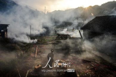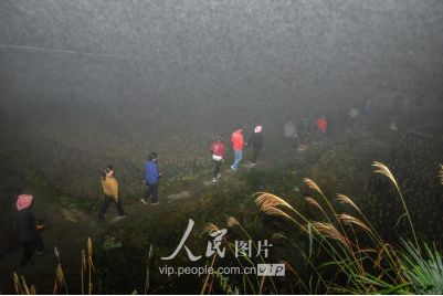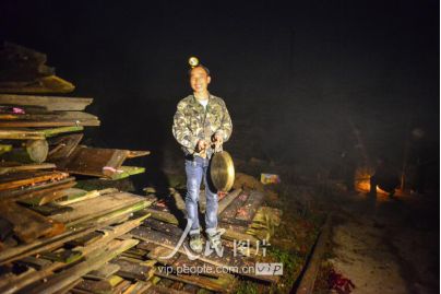 新娘之所以“不落夫家”,一是仍要报答父母的养育之恩;二是舍不得童年伙伴,还要回到寨子里与伙伴们伴做伴,最长可达三年之久;直到同伴都有了对象才分散,新娘方到新郎家长住下去,这样的奇趣婚俗也在黔东南的一些侗族地区一直得以保存下来。图为11月17日凌晨,新郎家派来的娶亲队伍点着火把前来娶亲。