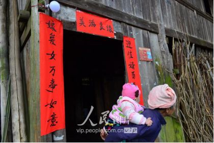 11月17日,新娘潘芝银家门前张贴的结婚喜联。