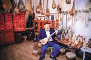 民族乐器制作技艺(维吾尔族乐器制作技艺)国家级传承人艾依提·依明在家中乐器陈列室演奏民族乐器。新华社记者 张曼摄