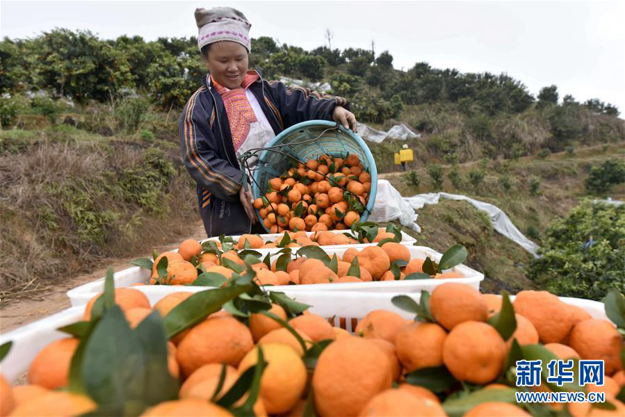 3月2日,在贵州榕江县忠诚镇王岭村砂糖橘种植基地,果农在装运砂糖橘。
