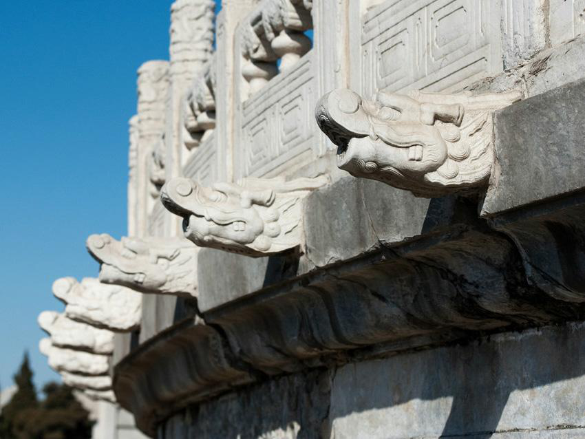 北京天坛祈年殿有三层月台,第一层月台上的排水构件是云头,第二层的是凤头,第三层则是龙头,这个龙头就是螭首(chī shǒu)。同样,故宫太和殿龙凤云纹的望柱下就有排水螭首1142只,可以想见当大雨滂沱之时,螭首千龙吐水是何等壮观的场面。