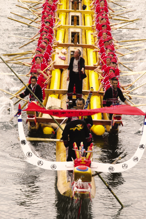 “苗族第一龙舟”全长77.8米,宽2.5米,整舟由一条主舟与两条子舟组合而成,主舟居中,子舟为辅船,组装在主舟左右两侧,两条子舟分别长58米。整船可承载桨手160人,舵手、鼓手、锣手等共20人,总计180人。