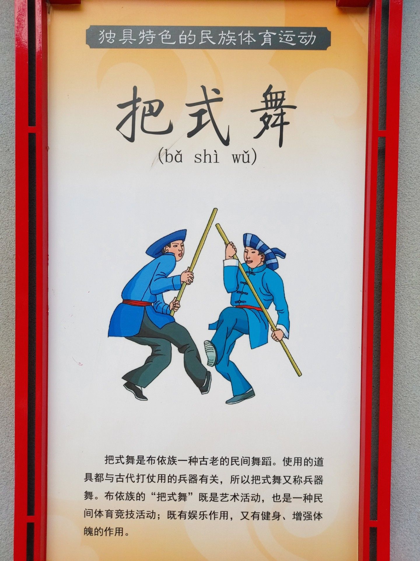 把式舞是布依族一种古老的民间舞蹈。使用的道具都与古代打仗用的兵器有关,所以把式舞又称兵器舞。布依族的“把式舞”既是艺术活动,也是一种民间体育竞技活动;既有娱乐作用,又有健身、增强体魄的作用。