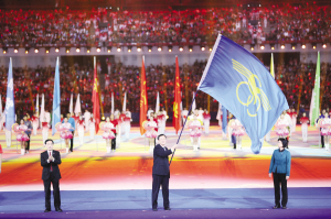 闭幕式上举行了全国少数民族传统体育运动会会旗交接仪式,第十二届全国少数民族传统体育运动会将于2023年在海南省举办。 民族画报社记者 赵利 摄