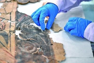 在山西大同云冈石窟研究院壁画文物修复室,工作人员在进行壁画修复。新华社发
