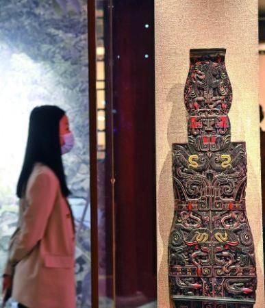 在位于北京的恭王府博物馆内,观众在参观展出的九连墩浮雕十弦琴。新华社发