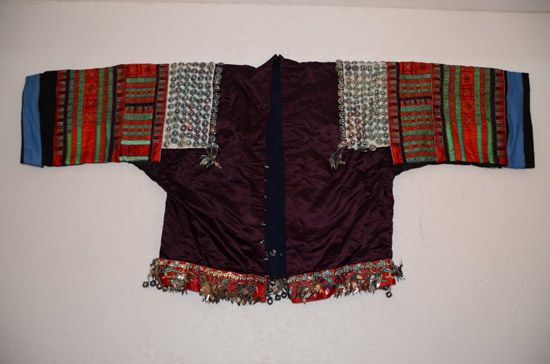 分布在凯里、雷山、丹寨、麻江四县交界地一带苗族村寨,以凯里舟溪苗族为代表。该服装上衣为缎面对襟衣,刺绣主要在肩袖及袖口部分,以黔东南苗族特有的茧片绣为主,所绣图案为浮萍花和几何纹,肩部和背部镶有银泡和银片,具有民族特点 。前、后围腰片均以茧片绣为主,所绣图案为浮萍花和几何纹。