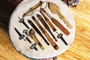 安宇歌介绍,口弦都是纯手工制作的,最难制作的部分是能发音的中簧。制作中簧时,选取原料须是圆形钢丝,先要将其砸扁,两边是尖的,整个簧的距离由宽到窄,窄的部位向上折弯成钩,留两公分长度,再折一小钩。并且,中簧需高温淬火,这是一个难度极高的环节,全凭手感。如簧不淬火便会弹性不好,淬过了头则一弹就碎,淬不到位会导致弹拨口弦时所发的声音不佳。从某种程度上讲,用口弦弹奏的音乐之所以引人侧耳,关键就在这根中簧上。