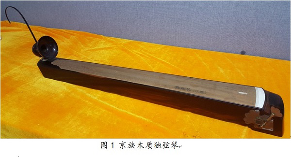 京族独弦琴的制作工艺传统,其材质有竹、木质两种。竹制独弦琴的琴体通常取大斑竹为原料,制作时选粗细匀称、质地密实的一段竹子,截长为120厘米左右长度,再劈成1/3和2/3两部分,取2/3部分的竹筒进行打磨、打孔,再安装竹制摇杆、麻绳或竹篾削制的琴弦,竹质独弦琴即制成;木质独弦琴的琴体多选生长于当地的桐木为原材料,取长约100-120厘米的木料,切割成数块木板,打磨后将木板拼成长方形木匣为琴身,一端插上一根与琴身呈直角的、用牛角制成的弧形柱子,圆柱上安装一瓢型(葫芦形)共鸣器,再将一根金属丝从瓢中心引向琴的另一端,固定在的弦钮上,木质独弦琴即制成。