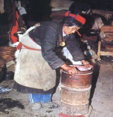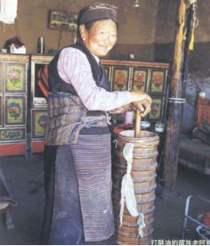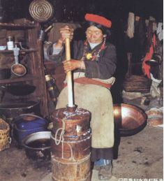 藏族生活在号称“地球第三极”的青藏高原上,高寒的高原气候,严酷的生存环境,造就了藏民族勇敢刚毅的民族个性,也形成了藏民族独具高原特色的饮食文化,藏乡的酥油茶便是其中一朵奇葩。酥油茶是藏乡群众日常生活所必需的一种饮料,也是藏族人民待客、礼仪、祭祀等活动不可或缺的用品,极具民族特色和文化内涵。刚进藏的汉族干部,要适应高原环境,首先要过生活关,其中重要的一条就是能不能喝酥油茶。顾名思义,酥油茶由酥油、茶和食盐三种原料做成。