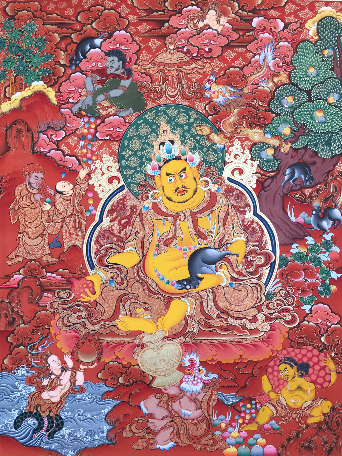 本尊形象为肚大身小,双手有力,肤色金黄,右手持摩尼宝珠,左手轻抓口吐珠宝的吐宝鼠。头戴五佛宝冠,身着天衣,蓝色莲花及珠宝璎珞作严饰。胸前挂乌马拉念珠,以如意坐左脚曲,右脚轻踩海螺宝,安坐于莲花月轮上。诚心持诵黄财神心咒,可获其庇护能财源广进,免除穷困,以及一切经济窘困。如果能发生无上菩提心,发愿救度一切众生于贫困,则福德更不可限量。