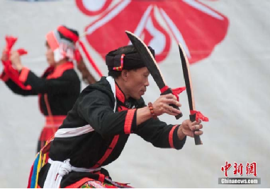 12月6日,在中国瑶族之乡广西金秀瑶族自治县的盘王节上,当地瑶族百姓在跳”刀舞”