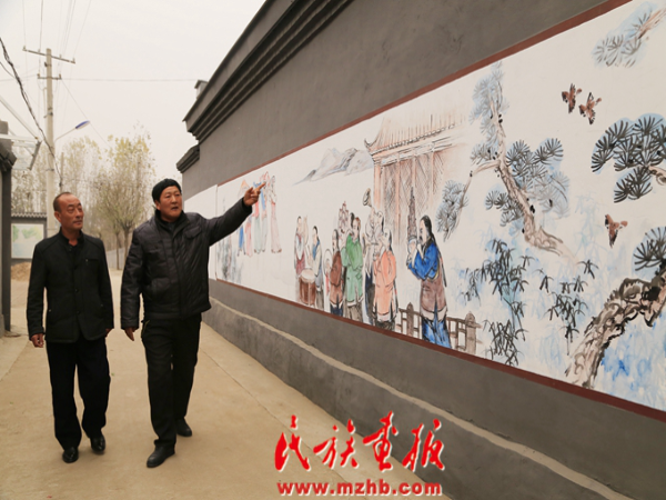 福山营村村支部书记罗玉龙(右)和村长罗术海(左)介绍街道文化墙上的壁画