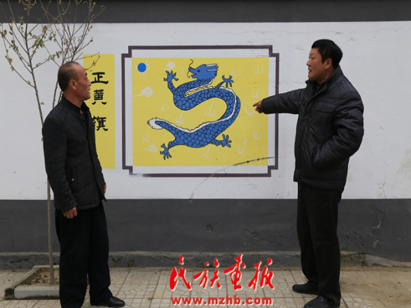 在福山营村街道文化墙边,村书记罗玉龙(右)与村长(左)罗术海正在谈论满八旗中的正黄旗