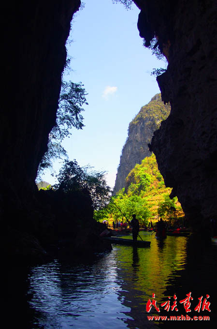 “坝美”是壮语的音译,意为森林的口子。我们来到这里时,只见刀削般的绝壁上有一个巨大的石洞,平静的河面上泛着几只船。坐上小船,逆流而上进入洞口。“林尽水源,便得一山,山有小口,仿佛若有光。”诗句中的景象仿佛穿越时光隧道,活灵活现地展现在我们面前。