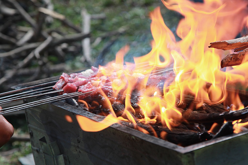 负责烧烤者将串好的肉串在水里蘸一下,再往长形的白铁皮烤串炉上一放,“刺啦刺啦”的油脂滴在炭火上,白气与火苗齐窜,再往肉串上洒孜然、辣椒、盐,一股蓝色的香气喷涌而出,撩拨着人们的味蕾。烤肉者两手交替翻转,依经验把握时间及火候,出炉前再均匀洒上一遍调料,这一大把烤肉就出炉了。
