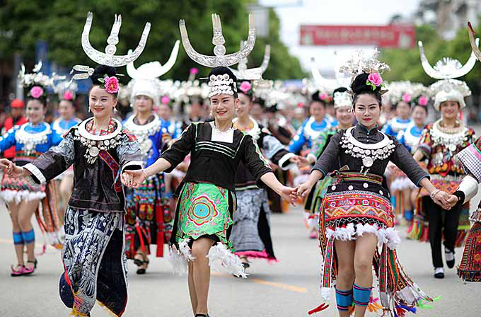2017年4月28日,黔东南苗族侗族自治州丹寨县盛大举行“云上丹寨•远古霓裳”丹寨八大支系服饰巡游活动,来自全县六个乡镇八大支系的2000余名苗族同胞身着节日盛装,集聚在县城锦鸡广场进行服饰展演(黔东南苗族侗族自治州人民政府网)