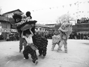 舞狮吸引众人围观,颇显热闹