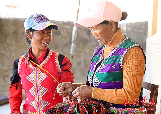 在娜巴来家,两位表姐正在绣佤族服饰背包