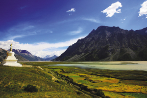 我们沿着湖畔徜徉,不经意间步入了一片牧场,只见一群牦牛在吃草,远处的岗日嘎布雪山神奇而壮丽。雪山的冰雪融水构成了然乌湖主要的补给水源,然乌湖向西蜿蜒十余千米逐渐收缩成一道河谷,旁边有一处藏族的小村庄,美得好像世外桃源一般,这就是传说中的瓦巴村。村民们依湖而居,湖边的平地是他们的牧场和田埂。散落在这里的几户人家,屋旁都插着颜色各异的经幡,随风阵阵摆动。