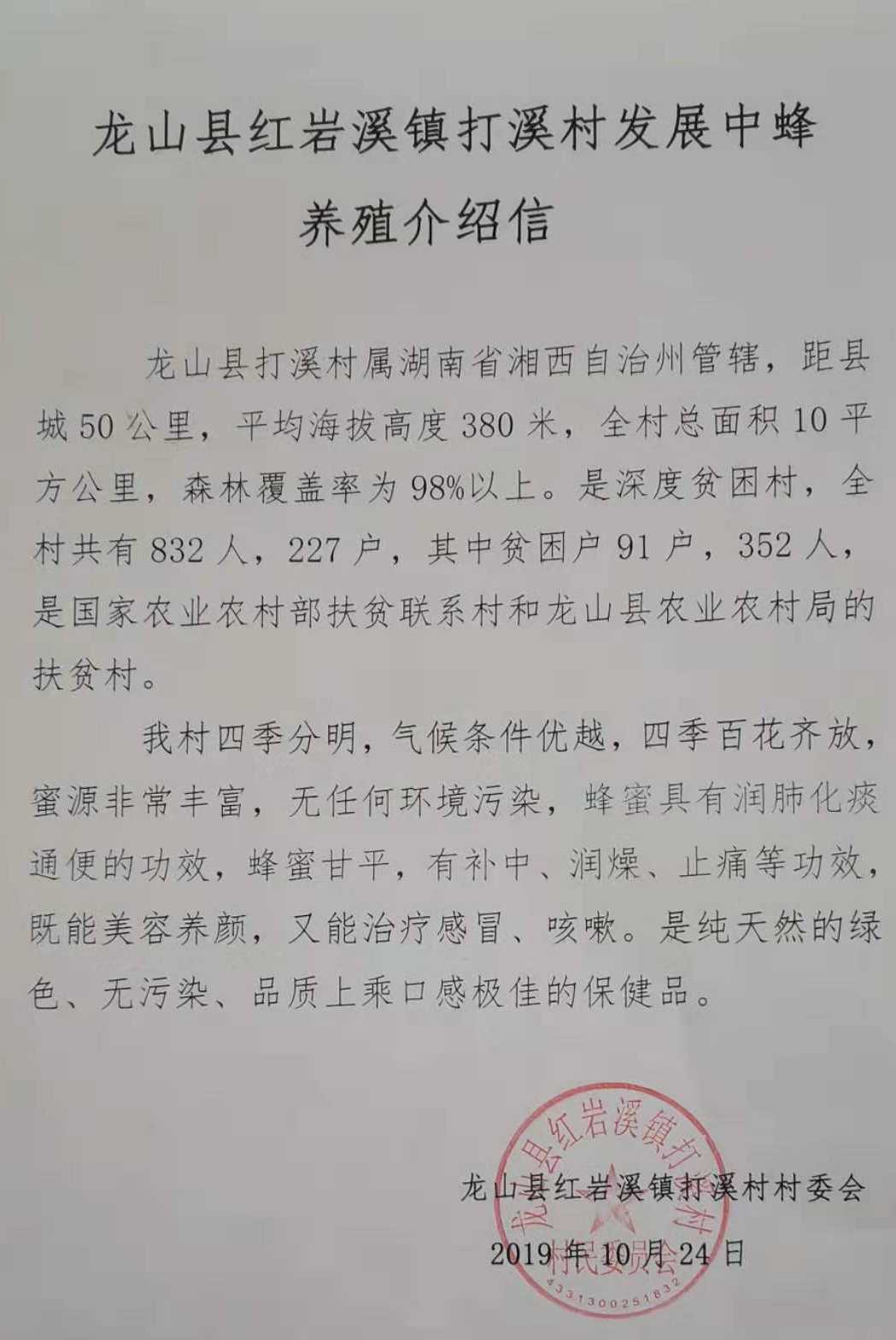 这里四季分明,气候条件优越,四季百花齐放,蜜源非常丰富,无任何环境污染。据湖南省湘西州龙山县红岩溪打溪村支部书记沈世平介绍:“我们这儿已经有很长的养殖蜜蜂的历史,环境无污染,田土少,属于纯天然养殖,无农药,利于中蜂的养殖,并且在2019年4月份的时候,通过农业部及农业科学院的专家实地考察,认证为最佳养蜂环境。今年获得乡政府帮扶,规划从龙山县中心养殖合作社引进50箱进行集中养殖,明年开始分设4点,一个点150箱,扩大产量,并向全县推广。”
