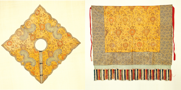 图为清代藏传佛教僧人法衣(桔黄地宝相花织锦披肩与织锦裙),中央民族大学民族博物馆馆藏