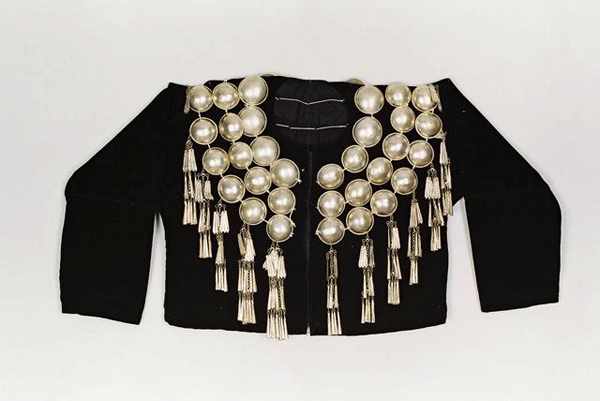 民族文化宫博物馆收藏的这件银饰“孔雀衣”,是景颇族女子盛装时的一种服饰,征集于云南省德宏傣族景颇族自治州陇川县,时间为20世纪50年代。这件银饰“孔雀衣”长40厘米,胸围108厘米,黑色平绒布制作而成,圆领对襟,领部、肩部和胸部坠银泡、银链、银穗装饰,黑白两色相映成趣,精致华美。银泡为三圈,由里至外逐圈增大,里层银泡直径约2厘米,最外层银泡直径约3厘米。外圈银泡每个上坠有三角型银片打制的银穗,每串分三层,每层分别挂2、4、6个不等的三角型银片。整个上衣几乎被银泡、银链和银穗遮盖,穿上银饰“孔雀衣”,银泡在太阳的照射下银光闪闪,行动起来身动银摇,悦耳动听。