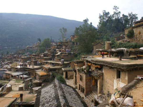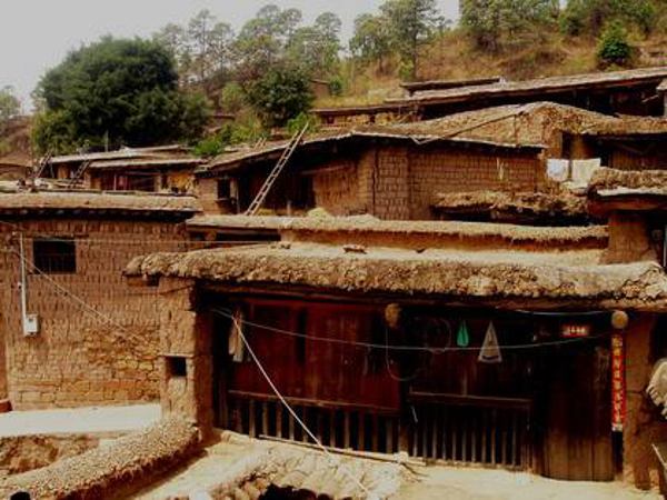 彝族是农牧兼营的民族,村寨的分布与坐落有其独特的传承。彝族的村寨多坐落在海拔2000~3000米的山区、半山区,相沿聚族而居。为适应西南地区亚热带气候和山地特点,彝民们便就地取材,以一种最容易、最节省钱财人力的建房方式,创造出中国建筑的独特样式——土掌房。土掌房多建于山地斜坡上,以石为墙基,用土坯砌墙或用土筑墙,墙上架梁,梁上铺木板、木条或竹子,上面再铺一层土,经洒水抿捶,形成平台房顶,不漏雨水。有的大梁架在木柱上,担上垫木,铺茅草或稻草,草上覆盖稀泥,再放细土捶实而成。