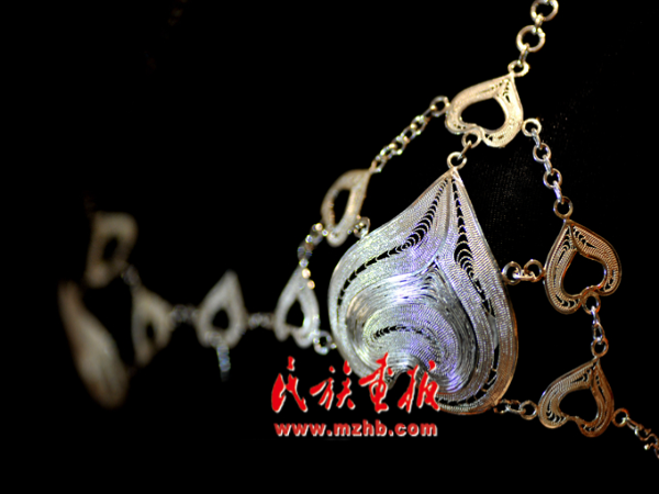 在龙太阳的作品“蝶恋花”上,我们看到了蝴蝶的纹样。苗族人相信,“蝴蝶妈妈”是所有苗族人共同的祖先。因为苗族没有文字,他们便将记忆倾注在银饰中。