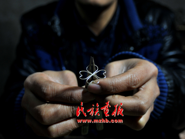 将搓好的银丝掐出不同的图案,嵌进事先做好的银丝框内。这个过程相当精细,银匠不需模具,