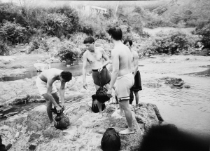 有一天,我在通什(今五指山市)的一条河边,看见有几个黎族人抱着大葫芦过河。我赶紧拿出相机,在河边的大石头间跳来跳去追拍。没想到一不留神就跳空了,重重地摔在石头上,造成了骨裂,当时就不能动弹了,在医院里躺了好长一段时间。