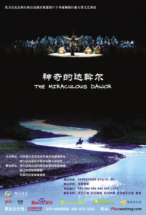 作为内蒙古自治区莫力达瓦达斡尔族自治旗(以下简称“莫旗”)庆祝建国60周年的活动之一,2009年3月26日至27日,北京保利剧院迎来了一场名为《穿越千年——神奇的达斡尔》(以下简称“《神奇的达斡尔》”)的大型文艺演出。这台主要由乌兰牧骑倾情奉现的演出分《亘古风云》、《山魂水魄》、《日月同歌》、《天地祥和》、《阳光灿烂映山红》5部分,分别展现达斡尔族在历史、文化、艺术、体育等多方面的成就和风情,可谓一场立体的非物质文化遗产展览。