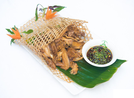 傣族传统家常风味菜,特点是软嫩鲜甜,原汁原味。制法是将鲜鱼去鳃和内脏,洗净,将葱花、姜末、蒜末、青椒末、青姜叶末、芫荽末、野花椒叶末、薄荷、茴香叶末、香茅草叶末、草果粉、味精、盐、料酒拌制成馅,装入鱼腹,头尾折拢,再用香茅草捆成十字,外面包以芭蕉叶,埋入木柴烧后的炭或热灰中烧熟,取出去掉芭蕉叶和香茅草,装盘即成。