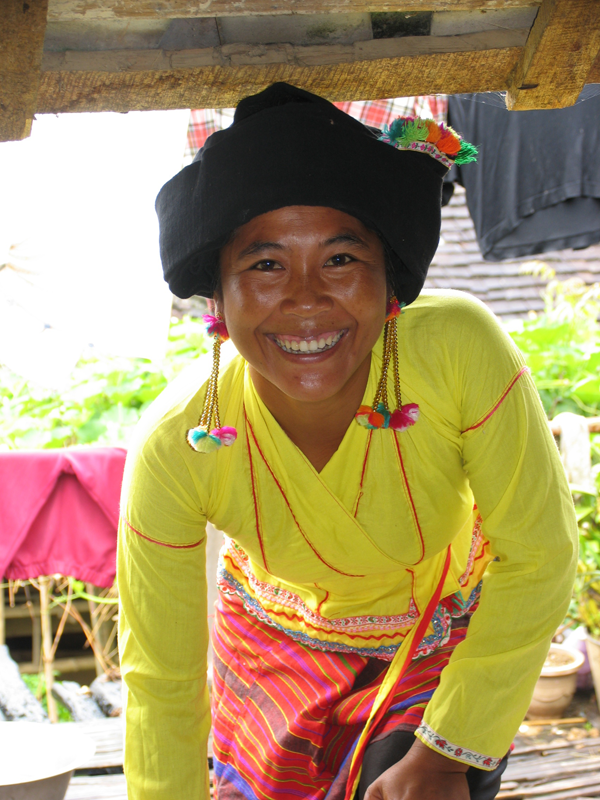 妇女的衣裙与傣族相似,上穿紧身短衣,头顶挽髻,用头巾缠头,喜欢戴大耳环、银手镯等装饰。姑娘爱戴野花或自编的彩花,将双颊染红。一般,女子上着左右两祚斜襟窄袖黑色小褂,小褂为圆领、紧腰、宽摆,短及臀部,在左肋下拴线打结,已婚妇女用黑色布料,未婚姑娘喜浅蓝色或白色。里衫为无袖贴身夹衫,下穿两条筒裙,内裙为白色,外裙有两色,臀部以上为红色横条,腿下为绿色或黑色,用布条或花边镶饰。未婚妇女用黑或蓝布包头;已婚妇女梳发髻,插银簪,顶端镶3颗棱形玻璃珠,下系银链,缠包头。妇女戴银耳环、项圈、手镯等饰品。