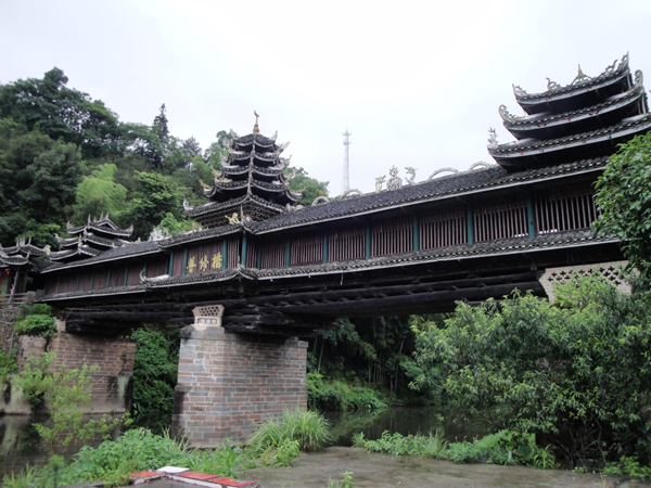 要到侗寨必须先过一座名为普修桥的风雨桥,该桥桥坐落于坪坦河上,始建于清乾隆年间,后毁于洪水,清嘉庆八年(1812)重修,1984年复修,2007年3月寨民对桥体进行维修。桥全长57.7米,宽4.2米,等分成21廊间,桥廊两侧设置通长直棂窗,四柱三间排架,桥身为重檐长廊,分设三座桥亭,桥两端各设一桥门,桥门为重檐歇山顶。两边桥亭为三重檐,方形平面歇山顶式,中间桥亭有七重密檐,下三层为方形平面,上四层为八角攒尖葫芦顶。1988年,通道侗族自治县人民政府行文公布为县级文物保护单位,1989年公布法定保护范围和建设控制地带。现在主要功能为新寨与外界联系的纽带和村民休闲娱乐场所。