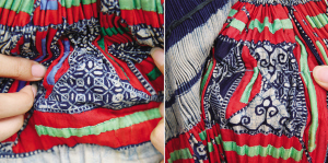 王明芬制作的百褶裙及其局部蜡染纹样。