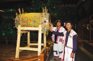 基诺大鼓被基诺族人视为本民族的“根谱”。图为白腊先(右)在基诺族博物馆中轻抚基诺大鼓。