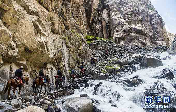 喀拉塔什其木干村村民驮队沿着崎岖的山路前往夏牧场