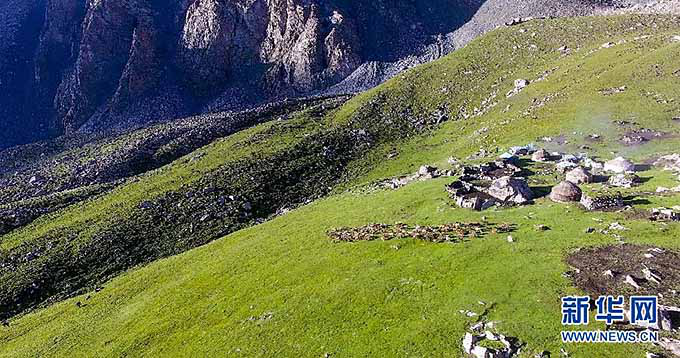 在“铁日孜窝孜”夏牧场,喀拉塔什其木干村的村民们清晨将羊群赶到牧场上吃草