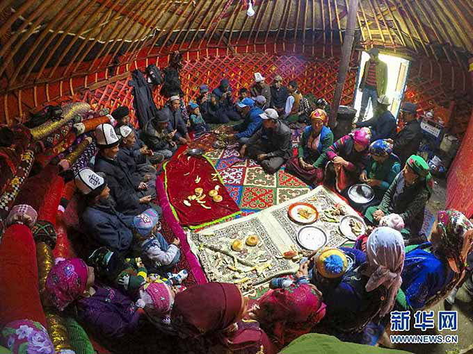 在“铁日孜窝孜”夏牧场,喀拉塔什其木干村的村民们聚在一起分享美食
