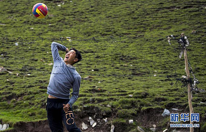 开学就该上高三的喀拉塔什其木干村村民图润塔依·艾沙买买提用木棍和简易的网子在家门口的空地上划了一块排球场