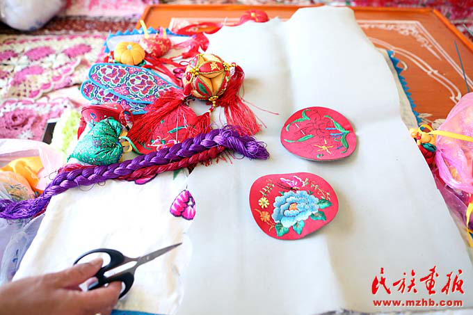 走进她的家中,只见不大的房间中摆满了荷包、绣花鞋垫、枕头等刺绣品。桌上五颜六色的彩线旁,马阿英社和儿媳妇正聚精会神地依着设计好的图案“飞针走线”。
