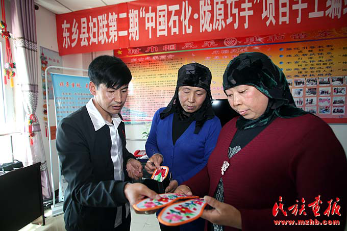 为了搞好营销,县妇联还发展了3名经纪人。来自百和乡的陈尕西木以前一直从事布鞋、窗帘等生产加工。2017年2月他成立了东乡族自治县梦馨圆民族刺绣有限公司,成为一名东乡刺绣的经销商。他说公司刚刚承接了3500个荷包、2000双鞋的订单。“订单多了,公司效益更好,老百姓也能有更多的加工费赚。”