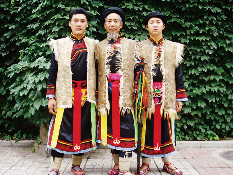 图片左为杨俊清,中为老释比朱金龙(杨俊清的老师),右为余正国(原是一名当地的羌语老师)。他们是当地有名的释比。    梁黎2008年摄于北京