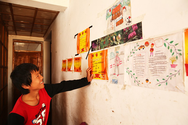 小家伙们带着我,去看父亲利用核桃树做的蜂巢,看村里集中修建的猪圈,看自家的旧屋——废弃的木楞房已改为鸡、兔的家。而龙家的新居,有院子、伙房和住屋。住屋有三间,客厅墙上贴满了奖状,它们都属于龙初杰。这些奖状的正中间是幅儿童画。“我的期末作业,这张《我的家》没舍得交,又另外画了一张《独龙江风光》交给了老师。”画中有新家、猪舍、水泥路、蜂房、发电机、小狗,以及国旗。
