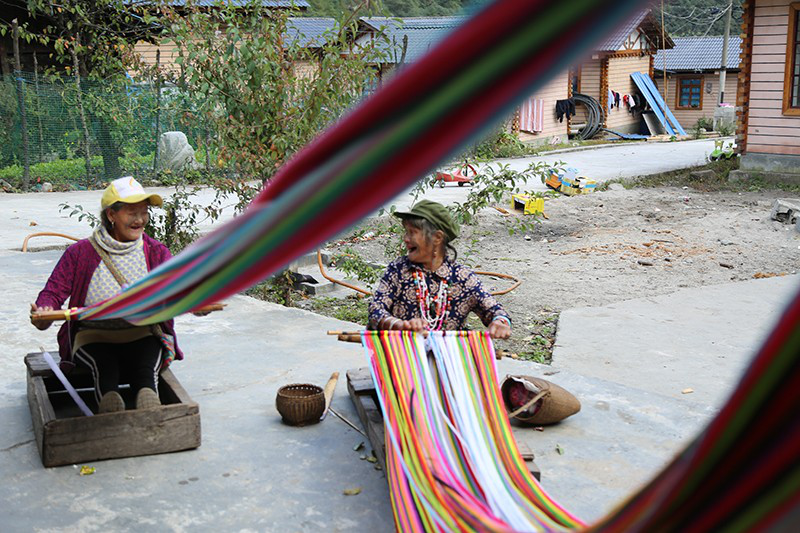 习总书记接见后,李文仕(左)回村继续织起独龙毯。如今独龙毯已成为独龙女重要的创收来源
