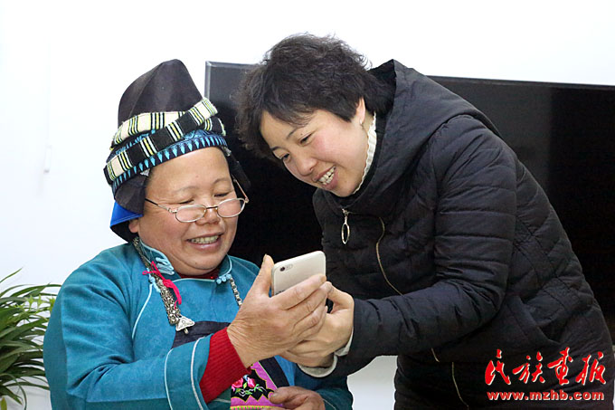 宁曼丽(右)和吴安丽在讨论长 10 米、宽 1.6 米的蜡画《百鸟图》
